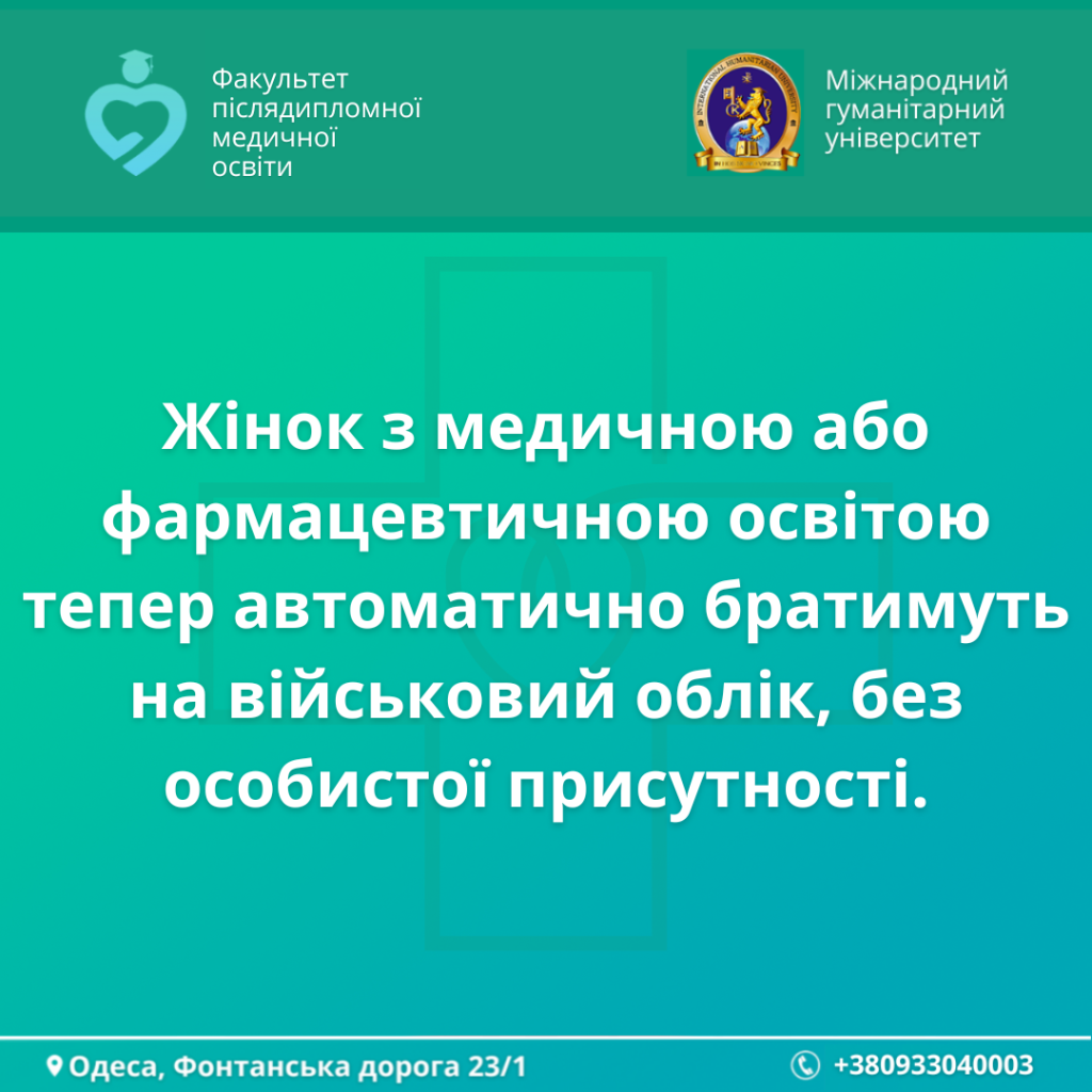 📆 Відтепер заклади професійної, фахової передвищої або вищої освіти, які здійснюють підготовку жінок за медичною або фармацевтичною спеціальністю, у семиденний строк після здобуття відповідної освіти подаватимуть список таких жінок за формою згідно з додатком 14 до Порядку № 1487 до районних (міських) ТЦК за зареєстрованим місцем проживання особи.