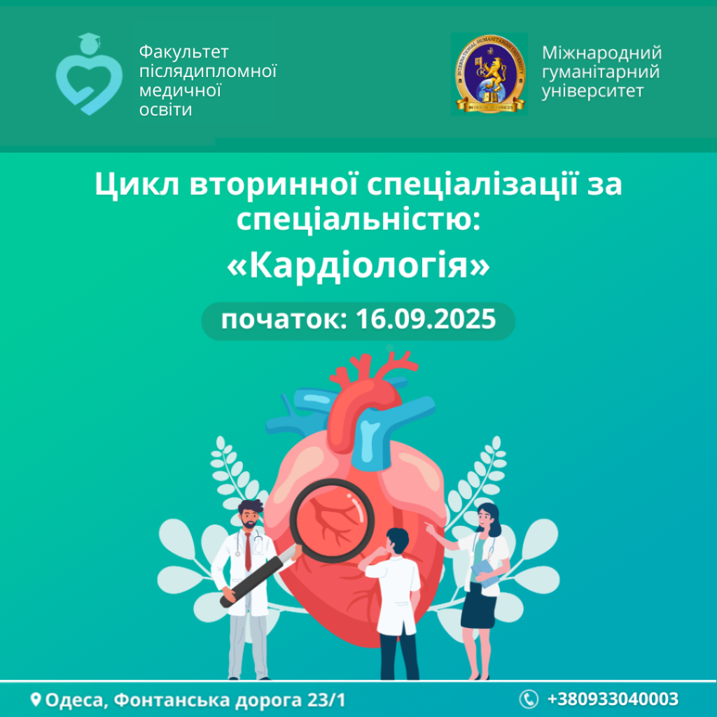 👋 Факультет післядипломної медичної освіти Міжнародного гуманітарного університету відкриває набір на цикли спеціалізації за спеціальністю «Кардіологія».